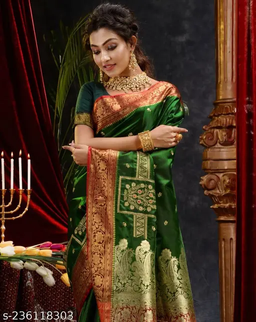 Green Banarasi silk sarees symbolize prosperity and fertility, often chosen for traditional ceremonies and rituals.