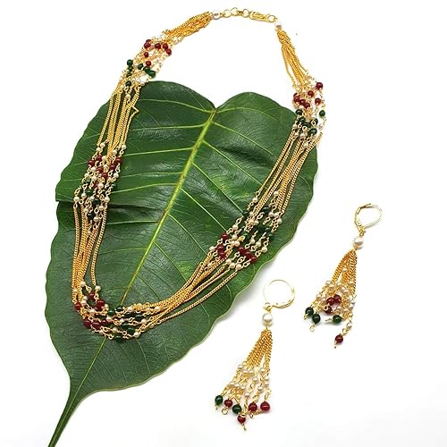 Multi Strand Gold Multi Layer Gundla Multicolor White Pearl Beads Mala Necklace Set with Hook Earrings for Women 16-inch Length Chain Mangalsutra Design Available on Amazon . Stylish and Trendy designer Mangalsutra for festival Perfect for all occassions after marriage shaadi. it comes with very fashionable detailed sparkling design to wear for regular wear and festivals .