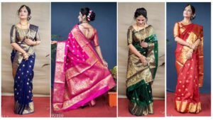 Kanjivaram Saree Also known as Kanchipuram sarees, these are luxurious silk sarees originating from Kanchipuram, a town in Tamil Nadu, India. They are highly prized for their rich texture, vibrant colors, and intricate designs. Kanjivaram sarees are traditionally handwoven using pure silk threads and often feature elaborate zari work (gold or silver thread) that adds a touch of opulence to the saree.