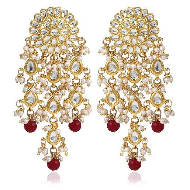 यह ईयरिंग सेट 18K गोल्ड प्लेटिंग के साथ आता है और इसमें फ्लोरल कुंदन वर्क किया गया है। बीड चेन और कुंदन स्टोन इसे एकदम ट्रेडिशनल और एलीगेंट लुक देते हैं। इसका डिज़ाइन शादी और इंगेजमेंट जैसे खास मौकों के लिए बिल्कुल सही है। लॉब्स्टर क्लैप्स की वजह से इसे पहनना आसान है और इसका ग्लो लंबे समय तक बरकरार रहता है। यह Earrings Design उन लोगों के लिए है जो हर मौके पर खुद को खास दिखाना चाहती हैं।