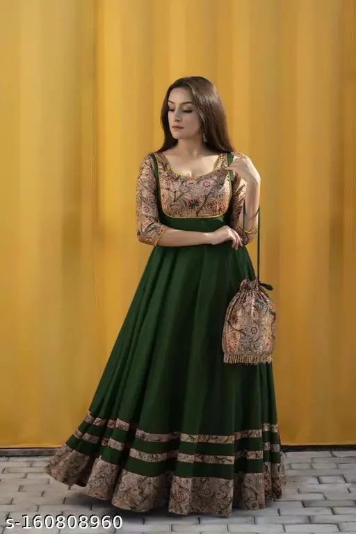 This green colored cotton gown is very stylish. Cotton fabric has been used to make it. There is a very beautiful golden printed design on this gown. You will get this gown with 3/4 sleeves. You can wear this gown in any Traditional party, Casual party, and evening wear.
