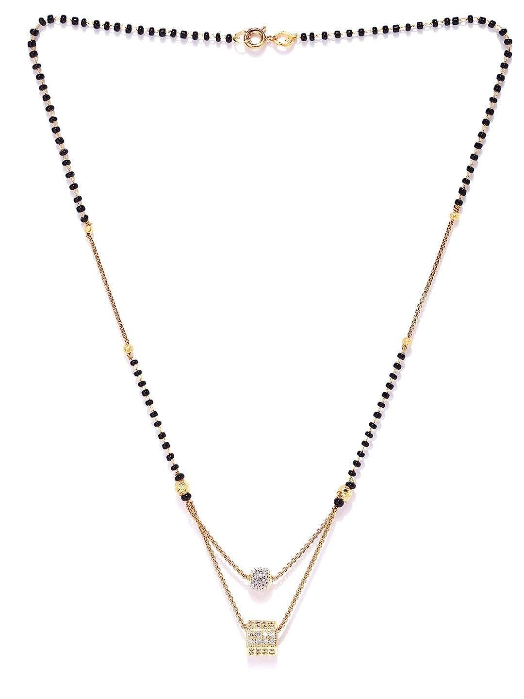 This mangalsutra is crafted in a dual-layered design that features sphere and cylindrical figures embedded with American diamonds. The gold-tone and black beads in this gold mangalsutra (plated) hold great importance in Indian tradition as they symbolize Goddess Parvati and Lord Shiva.