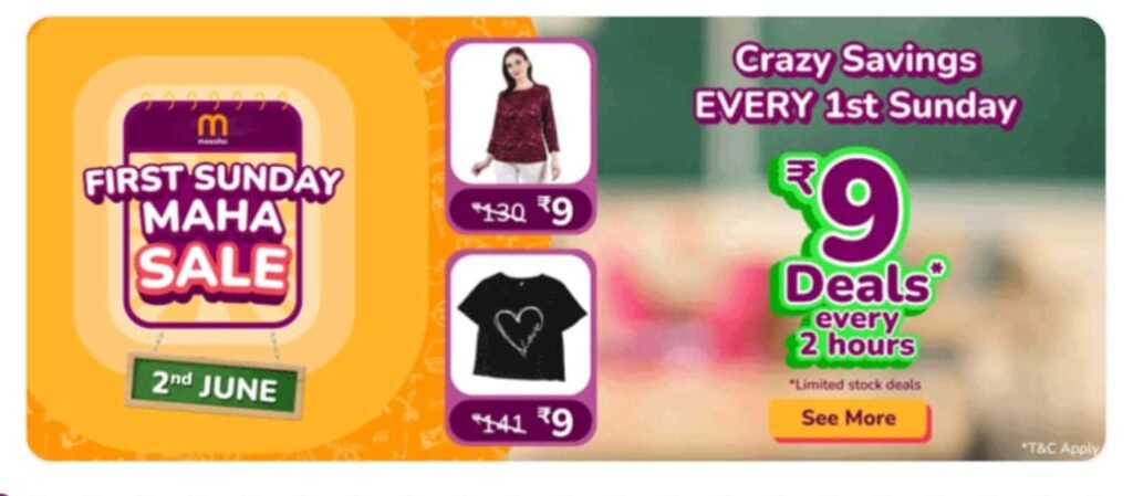During the First Sunday Maha Sale, Meesho promises huge discounts. Some products may have discounts of up to 70% on 3 Crore Products . Special deals will also be available for a limited time. Flash sales will occur throughout the day. Special Rupees 9 Deals* Every 2 Hours . Shoppers should keep an eye out for these time-limited offers. (* Limited Stock Deals )