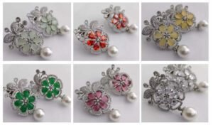 The AD Stone Lakshmi Maanga Haram South Indian Bridal jewellery set is a stunning and intricate ensemble designed for brides who seek elegance and tradition on their special day. This exquisite set features a long necklace known as “haram,” adorned with intricate craftsmanship and embellished with AD stones, which are high-quality artificial diamonds that mimic the sparkle of real diamonds. The Lakshmi and Maanga motifs, inspired by traditional South Indian jewelry, add a touch of cultural richness to the set. The craftsmanship showcases meticulous detailing, reflecting the artisan’s dedication to creating a timeless piece. This South Indian bridal jewellery set not only enhances the bride’s beauty but also serves as a symbol of cultural heritage and opulence, making it a cherished and significant part of the wedding ensemble.
