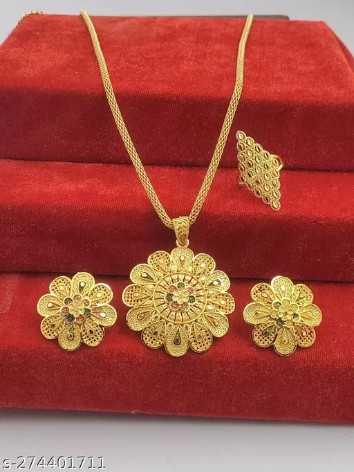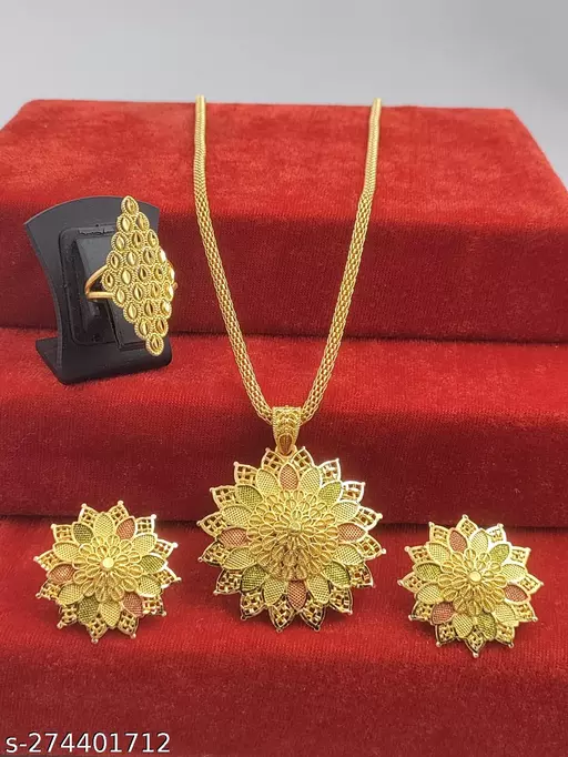 The necklace is the centerpiece of the set, featuring a delicate chain that sits elegantly on your collarbone. The earrings complement the necklace perfectly, with their dainty design and gold-plated finish. And let’s not forget about the finger ring, which adds a touch of glamour to your hands.